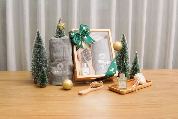 Essential Wellness menghadirkan suasana relaksasi melalui kombinasi aroma, tekstur, dan elemen kayu jati. Selain itu, tim Dekayu mengkurasi dan menyusun setiap isian hampers untuk memberi kesan hangat.