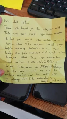 Dalam surat itu, Ibu S bahkan membagikan refleksi yang ia baca dari artikel tentang manfaat tersenyum — bahwa tersenyum kepada orang lain bukan hanya membuat mereka bahagia, tapi juga membawa manfaat bagi diri kita sendiri.